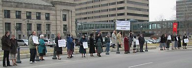 One protester showed up as a result of a news broadcast announcing the protest that very morning. He said he was glad that someone was standing up to this exhibit and saying no. Another was in the area, saw the protesters, got out his rosary and joined in the prayers of reparation.