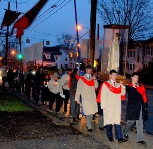As Saint Veronica did during the passion, 27 brave Catholics gathered at the place of infamy to pray and humbly offer reparation. A cold wet April shower did not dampen the singing of hymns or prayers but instead displayed the seriousness and resolution of those present.