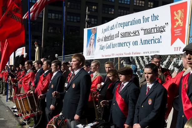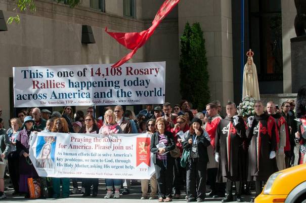 TFP volunteers attended the high-profile Rosary Rally in front of Rockefeller Center in Manhattan, New York. In the majestic shadow of the newly restored Saint Patrickâs Cathedral on Fifth Avenue, the din of traffic was temporarily subdued by the calm recitation of the rosary, punctuated at intervals by Marian hymns executed by the youthful TFP bagpipe, brass and drum corps.