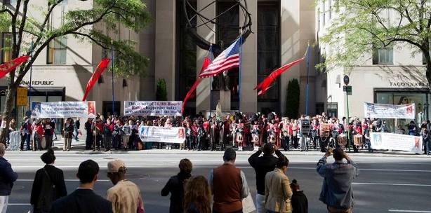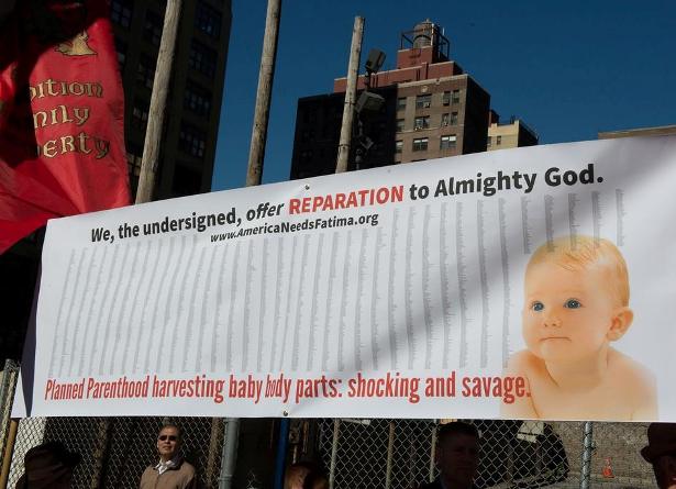 After a solid hour of prayer at Rockefeller Center, TFP volunteers marched some twenty blocks to the Planned Parenthood Federation of America building located on West 33rd Street to pray for the end of abortion. Here more prayers were recited and âreparation, reparation, reparationâ was chanted by those gathered as a way to console the Sacred Hearts of Jesus and Mary for the grave sins of abortion and homosexual âmarriageâ in our land. Taking notice of the prayer rally at their doorstep, Planned Parenthood employees exited their building and paced to and fro with agitation, snapping photos of the peaceful protest. Reactions from pedestrians varied greatly: some mumbled insults, others expressed approval.