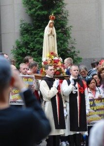 In over 7,515 locations throughout the U.S. and in 22 foreign countries, thousands of people honored statues of Our Lady of Fatima, held rosaries, prayed and sang in contrast to the images of protest on Wall Street and elsewhere.