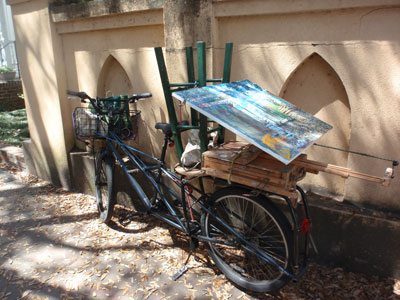 One such painting is of the White Point Gardens2 located in the heart of Charleston’s historic district. This particular piece sells for $53,000, but don’t let the price fool you. DAB is not independently wealthy. The half eaten apple, his lunch for the day we first met, and the beaten up bicycle he rides around town on, are proof that he is not rolling in dough.