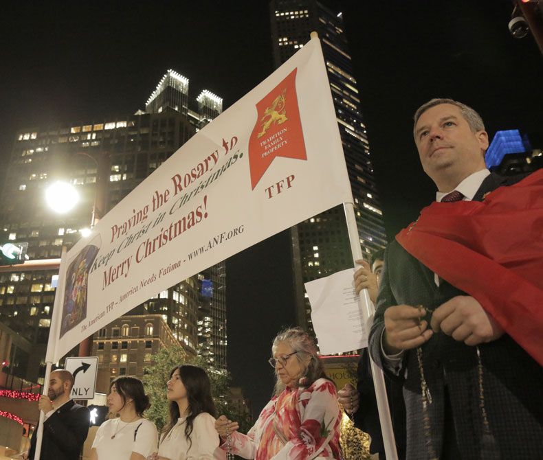 Cesar Franco, the local TFP member in Houston, started the rally with the primary intention for the rosary, “We are here to console the Sacred Heart of Jesus and the Immaculate Heart of Mary for the vile mockery of Christmas taking place in this music center.”