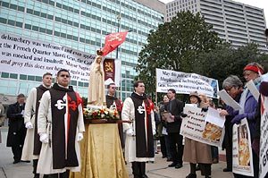Three hundred Catholics gathered in front of New Orleans City Hall to pray and express their outrage for the blasphemous anti-Catholic floats in the French Quarter Mardi Gras promoted by the Krewe du Vieux parade organizers. The peaceful protest specifically responded to attacks on the honor and purity of the Sacred Heart of Jesus and Our Lady of Prompt Succor in the 2005 Mardi Gras parade and revelries.