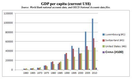Even if China’s GDP as published by its Communist rulers (thus to be taken with a grain of salt) were one day to equal that of the U.S., there is an often-forgotten detail: China currently holds the 100th place in the World Bank’s GDP per capita global ranking, between Angola and Tunisia!
