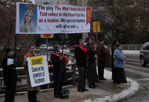 Periodically there are theatrical productions that reveal an utter disregard for the Church and the Blessed Mother and must be protested. One example was the blasphemous play, “The Most Fabulous Story Ever Told,” which portrays Our Lady, who is the Immaculate Conception, as a lesbian. This play was showing from December 5-8 at the Dallas Kalita Humphreys Theater in Dallas, Texas.