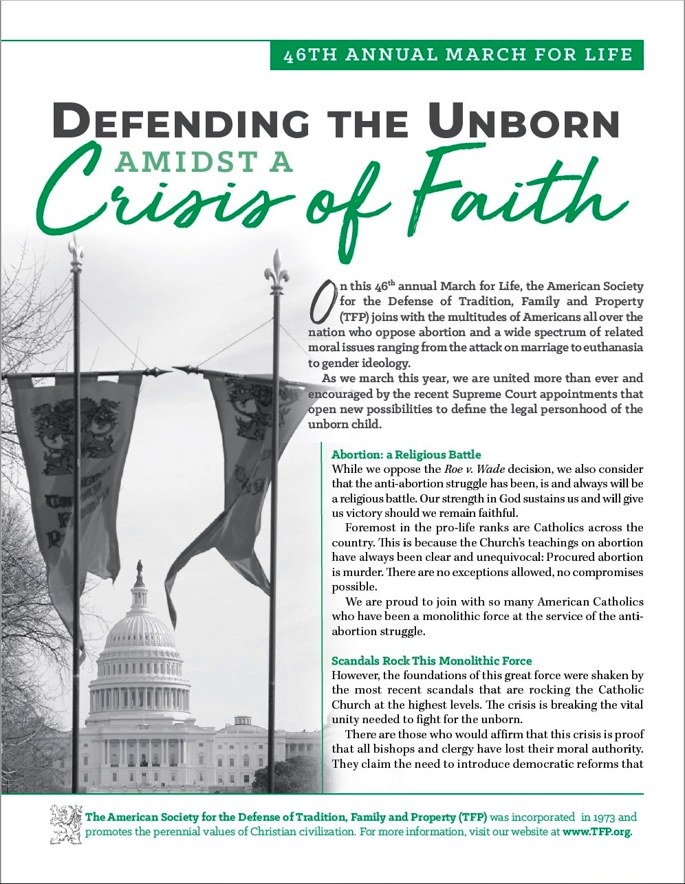On this 46th annual March for Life, the American Society for the Defense of Tradition, Family and Property (TFP) joins with the multitudes of Americans all over the nation who oppose abortion and a wide spectrum of related moral issues ranging from the attack on marriage to euthanasia to gender ideology.