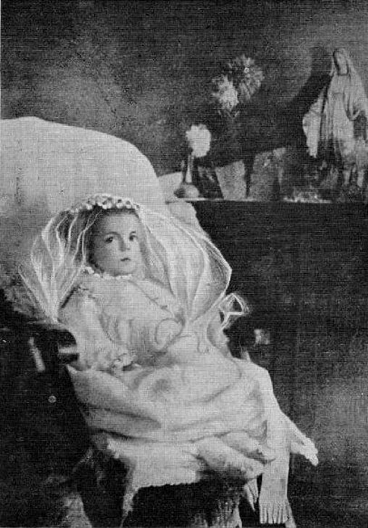 As foretold, her agony began on the morning of “God’s day”, Sunday, February 2, 1908, the Feast of the Purification of Our Lady. She was clothed in her First Communion dress. At three in the afternoon she became very calm and looked intently at “something” at the foot of her bed. She made an attempt to raise herself in that direction but was too weak. However, her gaze did not leave that spot. The look on her face was not the glazed expression of someone dying. Her eyes were filled with tears of joy as she appeared to be speaking to someone. Slowly her eyes moved upward, as if following that “something” over her bed. Moments later, with a smile of perfect satisfaction, she breathed her last. She was only four years, five months and eight days old.