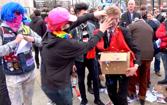 One Civitas Christiana demonstrator got so much glitters rubbed in his face that his eyes were red and painful. Campaign leader Hugo Bos was also attacked with glitter, rainbow flags and other materials. The police were there, but did little to oppose the open aggression.
