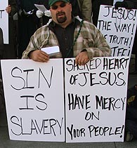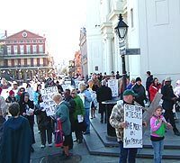 From there, a Rosary Walk of Reparation straight through the French Quarter turned many a head with the unfamiliar sight of Catholics carrying handmade signs and reciting the rosary of the Blessed Virgin Mary. The sound of prayer echoed down Orleans Street, moving toward the majestic statue of the Sacred Heart of Jesus. Passing by the Archbishop’s temporary residence, the protesters gathered in front of the locked Cathedral of St. Louis to recite a prayer of atonement to Our Lady of Prompt Succor, one target of the 2005 blasphemies. The next stop was at the monument to Saint Joan of Arc, patroness of New Orleans. Then passing St. Mary’s and the old Ursuline convent, the large group of “prayer warriors” returned to the starting point. Some still made it to St. Patrick’s Church for a closing solemn benediction.