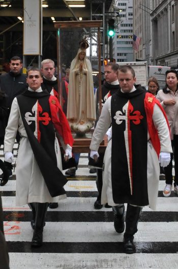 On Saturday October 11, however, there was a sea change which was impossible to ignore: more than 100 Catholics anchoring themselves on the broad sidewalks, praying the Most Holy Rosary for the nation. At noon members of the American Society for the Defense of Tradition, Family and Property (TFP) dressed in ceremonial TFP habit solemnly processed with the statue of Our Lady of Fatima. The resonant melodies played on the bagpipes reverberated off the towering skyscrapers.