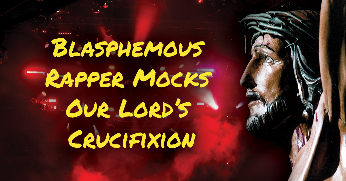 The openly-homosexual rapper has given previews of his new “Christian” rap, which include him dressed as Our Lord Jesus Christ, scarfing down altar wine and communion wafers like a snack, or being raised on a cross, surrounded by scantily-clad women.