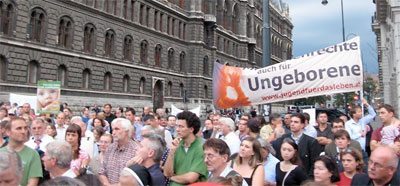 Prior to the event, Mass was celebrated by Most Rev. Andreas Laun, auxiliary bishop of Salzburg. He saddened worshippers by revealing that the Archbishop of Vienna, Christoph Cardinal Schönborn, had prohibited him from attending the demonstration. Bishop Laun was scheduled to lead the prayers and speak at the demonstration, but Bishop Laun explained “the Cardinal has phoned me and said that I am absolutely not allowed to attend the demonstration. Since he is the local bishop, I have to obey canon law.” Cardinal Schönborn did not give any reason for his ban, nor did he send anyone to take Bishop Laun’s place, a fact which caused much perplexity among the demonstrators.