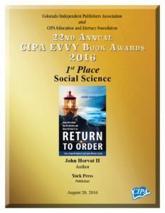 SPRING GROVE, PENN (Aug. 26, 2016) – The book, Return to Order, has just won its tenth award, a milestone that underscores the author’s message is resonating with an America that needs to find its moral compass. The book, written by John Horvat II, vice president for The American Society for the Defense of Tradition, Family and Property (TFP), earned First Place prize in the 2016 CIPA EVVY Book Awards in the Social Science category.