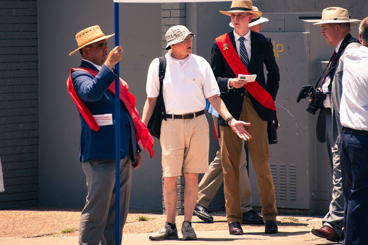 The caravan first held several campaigns in downtown Austin. TFP volunteers chanted slogans while others walked up and down the streets handing out flyers against socialism. It was only a short time before people showed their support.