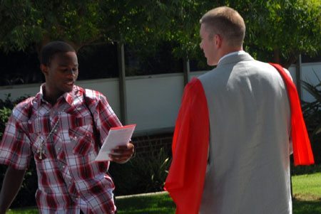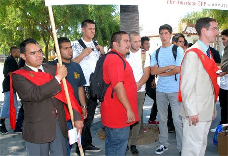 Today’s campaign was a great example of the so-called tolerance of the anti-marriage crowd. Our first stop was Mount San Antonio College. After receiving a permit from college authorities, TFP Student Action members set up in the free speech area. Yards away were a dozen or more booths promoting student clubs, including a booth pushing the homosexual agenda.