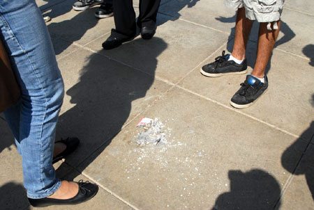White ashes, remnants of what was a TFP flier, blew in the wind at the feet of about 40 pro-homosexual students who gathered to harass TFP members. Several times, campus police warned them not to invade our space. However, they would not obey the authorities. Every 10 minutes or so, the cluster of frantic liberals moved closer and closer. Campus police would intervene, asking them to retreat. They would retreat for a short period of time, and then invade our space again jeering, cursing, yelling and blaspheming the name of God.