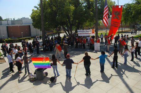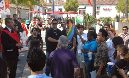 “Attention! Attention!” he shouted attempting to quite the bunch. “Some of you know me. I am a professor here at Mount San Antonio…” cheers ring out reminiscent of the mobs at the time of the French Revolution. “This is what you call a teaching moment. These people (TFP) are attempting to impose their religious views on America. But marriage is a civil institution and they have no business telling us what we can or can do!” More yells.