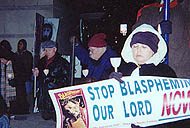 Protesters came from as far away as Pennsylvania, Ohio and Missouri, as well as from the Madison area. The protest was organized by the TFP’s America Needs Fatima campaign and was the culmination of six months of protests by email, post cards, faxes and phone calls to the Mayor of Madison, Dave Cieslewicz and the Bartell Theatre. Over one and a half million protest post cards were distributed nationwide. Mr. Cieslewicz did nothing to stop the production of the play, and attended it, setting a bad example.