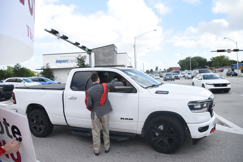 The following day, the caravan moved to Plantation, a suburb of Miami, where they campaigned on two different busy streets and received a constant barrage of honks and hand waving from passing cars.