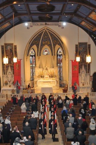 After many more conversations during a festive dinner, Saturday concluded with the traditional candlelight rosary procession. TFP members in ceremonial habit marched in procession before the American TFP’s life-sized statue of Our Lady of Hope, Macarena, carried on the strong shoulders of supporters. When the procession reached its destination, the melodious chants of the Salve Regina, Litany of Loreto, and Ave Maris Stella resounded in the cool autumn air, enchanting all present and giving fitting honor to the Queen of Angels.
