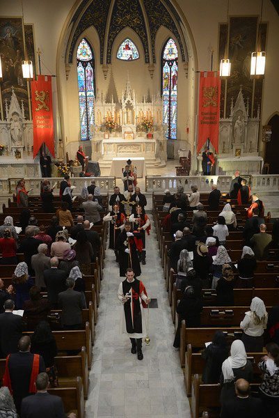 The Sunday afternoon came to a close with Holy Mass at Immaculate Conception Church in the neighboring city of York. A solemn procession with the statue of Our Lady of Fatima began the celebration, followed by the glorious strains of organ and trumpet accompanying a choir of TFP members singing the coronation hymn of St. Louis IX, “Gaude Felix Francia.” The sublime chants of the Mass then echoed throughout the magnificent church, with texts centering on Christ coming to reign over all nations. During the homily, those gathered were exhorted to have devotion to the Sacred Heart of Jesus and the Immaculate Heart of Mary in order to bring about the reign of Christ the King. The majestic Papal Hymn concluded the splendid ritual.