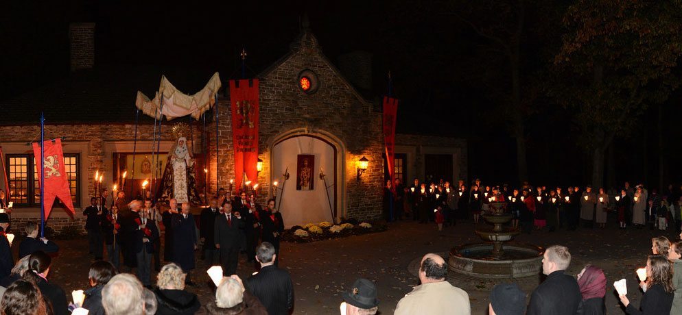 With the setting of the sun and the conclusion of a splendid dinner, the traditional candlelight Rosary Procession soon progressed through the grounds of the TFP’s headquarters. The glow of candlelight gently illumined the fall landscape, and the dignified ceremony left no doubt of the presence of the holy angels. The American TFP’s life-size statue of Our Lady of Hope, Macarena was carried on the shoulders of eight strong men, while the TFP members in ceremonial habit led the Sorrowful Mysteries. The Litany of Loreto concluded the event, followed by the resounding melodies of the “Salve Regina” and “Magnificat.” With the conclusion of the procession, the men carried Our Lady back into the chapel accompanied by the hymn, “Ave Maris Stella.” Though the statue of the Queen of Heaven soon disappeared from sight, the solemn ceremonies assured her a prominent place in the hearts of all present.