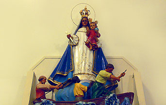The three were relieved that Our Lady had saved their lives. As they returned, they saw and then retrieved a white bundle floating on a piece of wood. The bundle turned out it be a sixteen-inch baked clay statue of the Blessed Mother holding Our Infant Redeemer in her left arm and carrying a gold cross in her right. Mary’s feet rested on a thin crescent moon, which in turn is carried on clouds borne by angels. Our Lord’s right hand is raised in blessing, and He holds a globe in His left. The piece of wood bore the words, “Yo soy la Virgen de la Caridad,” which translates to “I am the Virgin of Charity.”
