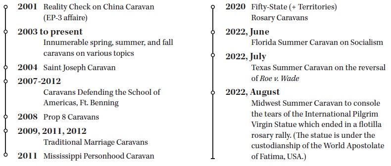 The American Society for the Defense of Tradition, Family and Property (TFP) employs many different ways of reaching out to the public. Some are common like online videos, web sites, e-mails, newsletters, mass mailings, talks, and street campaigns. There is an outreach that is unique to the TFP: the TFP caravans.