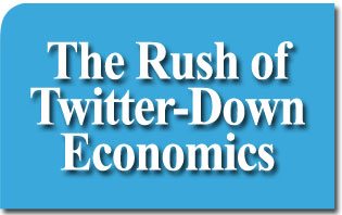In the nano-second rush of twitter-down economics, everyone grabs the part of the message they like so that it might be instantly posted. No one has time for explanations beyond those which can be texted. So much of what people believe is based on sound bytes designed to cause momentary sensations and emotional impressions. Anything vague or ambiguous can be, and is, tweeted into streams of confusing 140-character messages that cloud minds. The economic message becomes what you want it to be or even nothing at all.