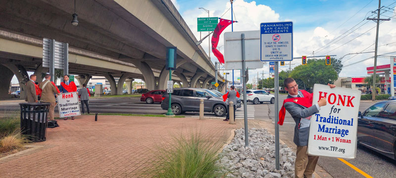 The number of honks of support was astonishing. At some busy intersections, the honking is so loud that the volunteers often cannot hear one another. At a campaign in Lake Charles, Louisiana, one man yelled with glee, “That’s right … it’s (traditional marriage) coming back!” Others cried out “God bless!” while honking their horns and beaming from ear to ear. Americans are clearly tired of the LGBTQ+ agenda being forced down their throats.
