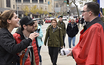 “Let’s put up the banner,” said TFP Student Action coordinator John Ritchie. “Then you will see debates.” The large banner was controversial and left no doubt to the passersby as to our message. It read “Let us pray for the end of the sin of abortion.” True to his word, the debates started happening.