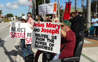 Sponsored by the American Society for the Defense of Tradition, Family and Property (TFP) and its Return to Order and America Needs Fatima campaigns, the protest quickly became a “victory and thanksgiving” rally. Jubilant protesters praying the rosary were thrilled to hear that Satan was kicked out of Boca Raton.