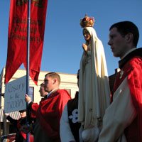 The oak studded median on Broadway offered a perfect location to pray for the troops in the open air. So we surrounded the statue of Our Lady of Fatima, escorted by two members wearing the ceremonial habit of the TFP; others held the American flag, the TFP banner, signs and posters.